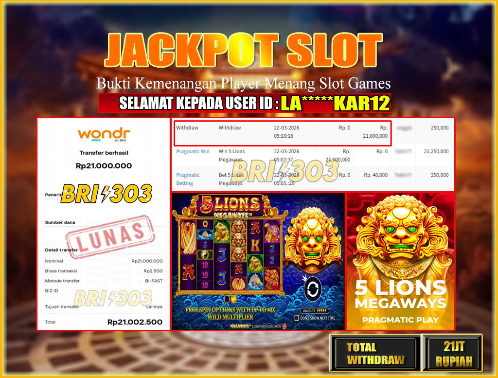 BRI303 JACKPOT SLOT GAMES : Selamat kepada User ID: LA*****KAR12 telah berhasil memenangkan hadiah besar senilai Rp.21.000.000  di permainan JACKPOT SLOT GAMES: 5 LIONS MEGAWAYS! Proses pencairan dana hanya memakan waktu 3-5 menit setelah pengisian formulir withdraw. Bukti pembayaran kami adalah SAH/VALID, langsung dari transaksi bank tujuan pemenang.