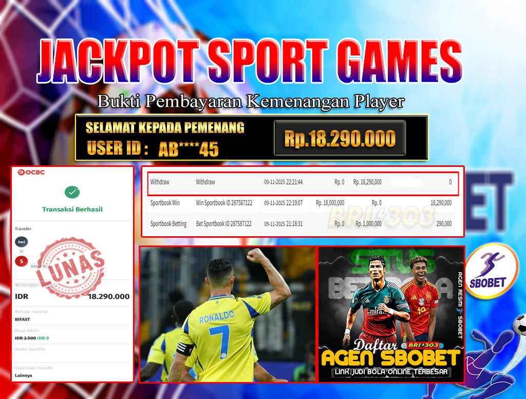 BRI303 JACKPOT SPORT GAMES 09 NOVEMBER 2025 Rp.18.290.000,- LUNAS