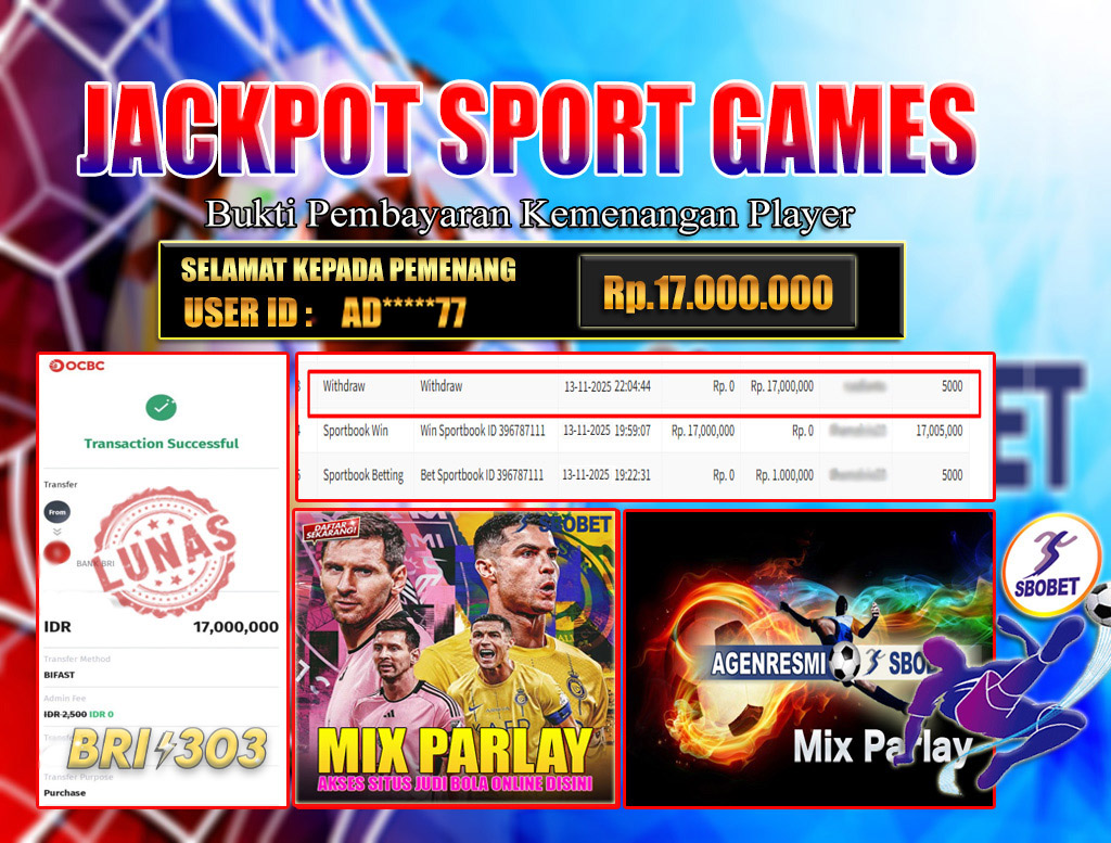 BRI303 JACKPOT SPORT GAMES 13 NOVEMBER 2025 Rp.17.000.000,- LUNAS