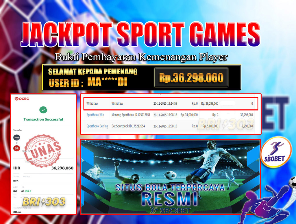 BRI303 JACKPOT SPORT GAMES 20 NOVEMBER 2025 Rp.36.298.000,- LUNAS