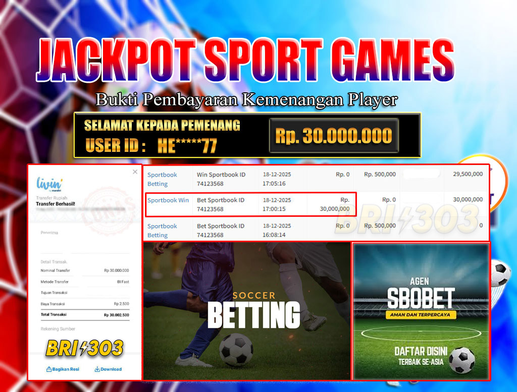 BRI303 JACKPOT SPORT GAMES 18 DESEMBER 2025 Rp.30.000.000,- LUNAS