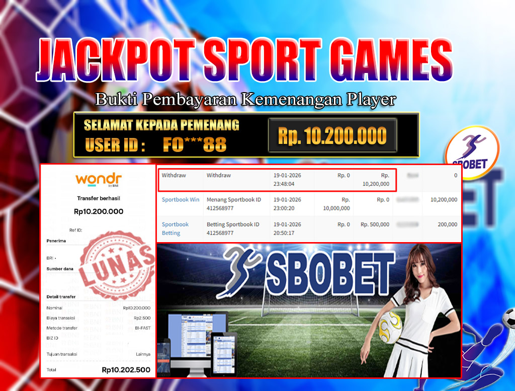 BRI303 JACKPOT SPORT GAMES: Selamat kepada User ID FO****88 telah berhasil memenangkan hadiah besar senilai Rp.10.200.000 di permainan JACKPOT SPORT GAMES : SBOBET! Proses pencairan dana hanya memakan waktu 3-5 menit setelah pengisian formulir withdraw. Bukti pembayaran kami adalah SAH/VALID, langsung dari transaksi bank tujuan pemenang.