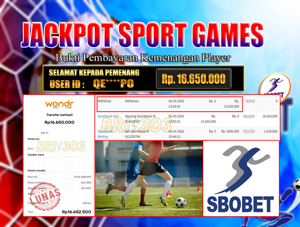 BRI303 JACKPOT SPORT GAMES 06 MARET 2026 Rp. 16.650.000,- LUNAS