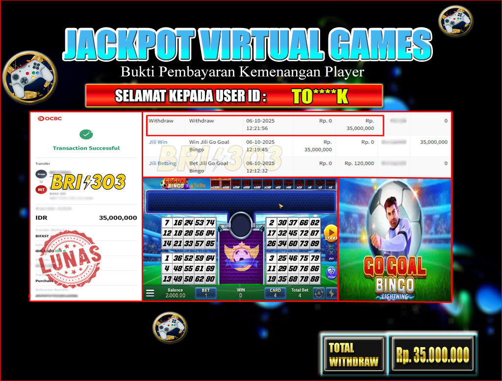 BRI303 JACKPOT VIRTUAL GAMES 06 OKTOBER 2025 Rp.90.000.000,- LUNAS