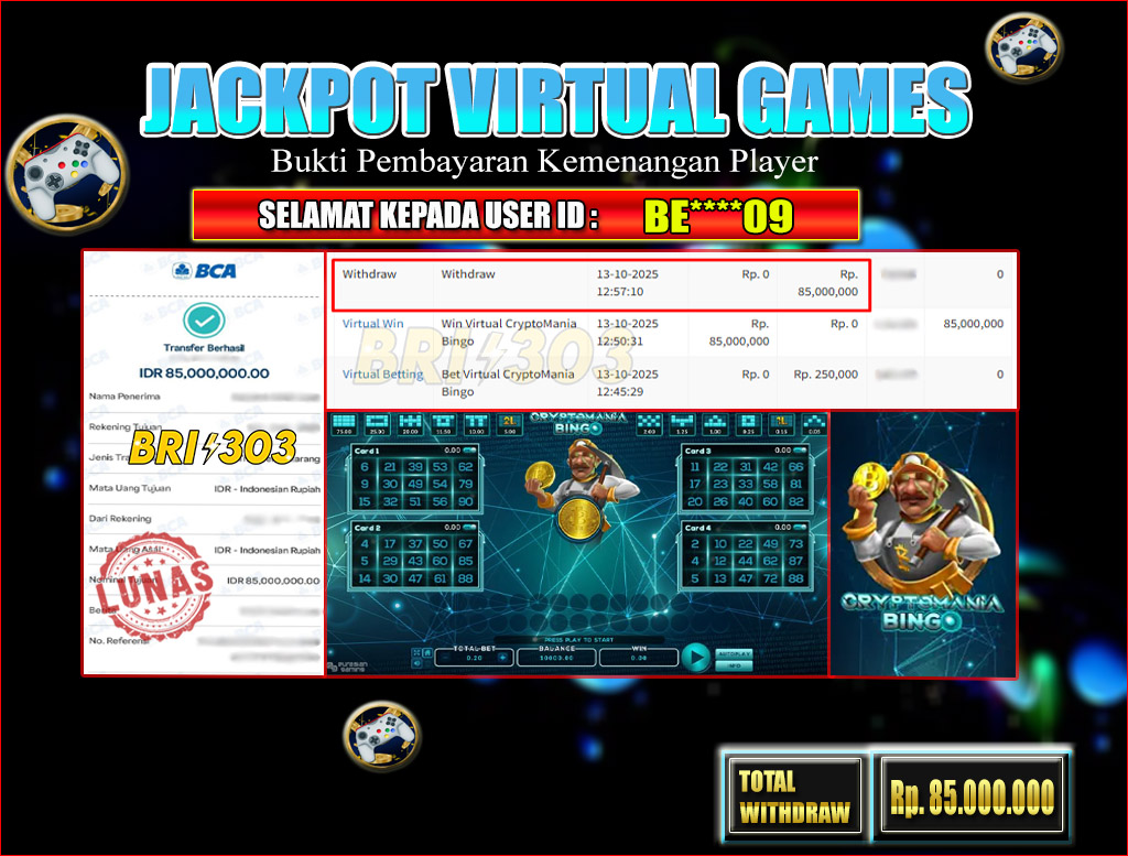 BRI303 JACKPOT VIRTUAL GAMES 13 OKTOBER 2025 Rp.85.000.000,- LUNAS