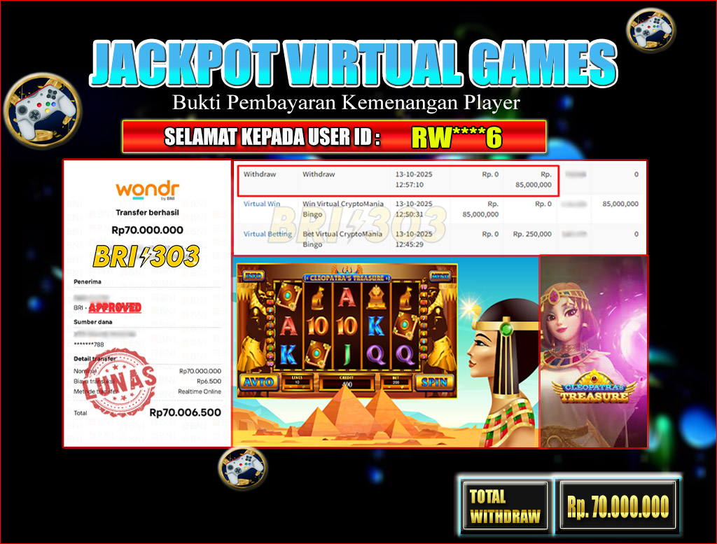 BRI303 JACKPOT VIRTUAL GAMES 15 OKTOBER 2025 Rp.70.000.000,- LUNAS