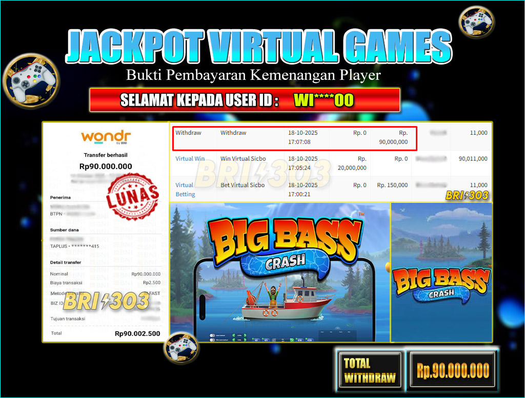 BRI303 JACKPOT VIRTUAL GAMES : Selamat kepada User ID WI*****00 telah berhasil memenangkan hadiah besar senilai Rp.90.000.000 di permainan JACKPOT VIRTUAL GAMES: BIG BASS CRASH!Proses pencairan dana hanya memakan waktu 3-5 menit setelah pengisian formulir withdraw. Bukti pembayaran kami adalah SAH/VALID, langsung dari transaksi bank tujuan pemenang.