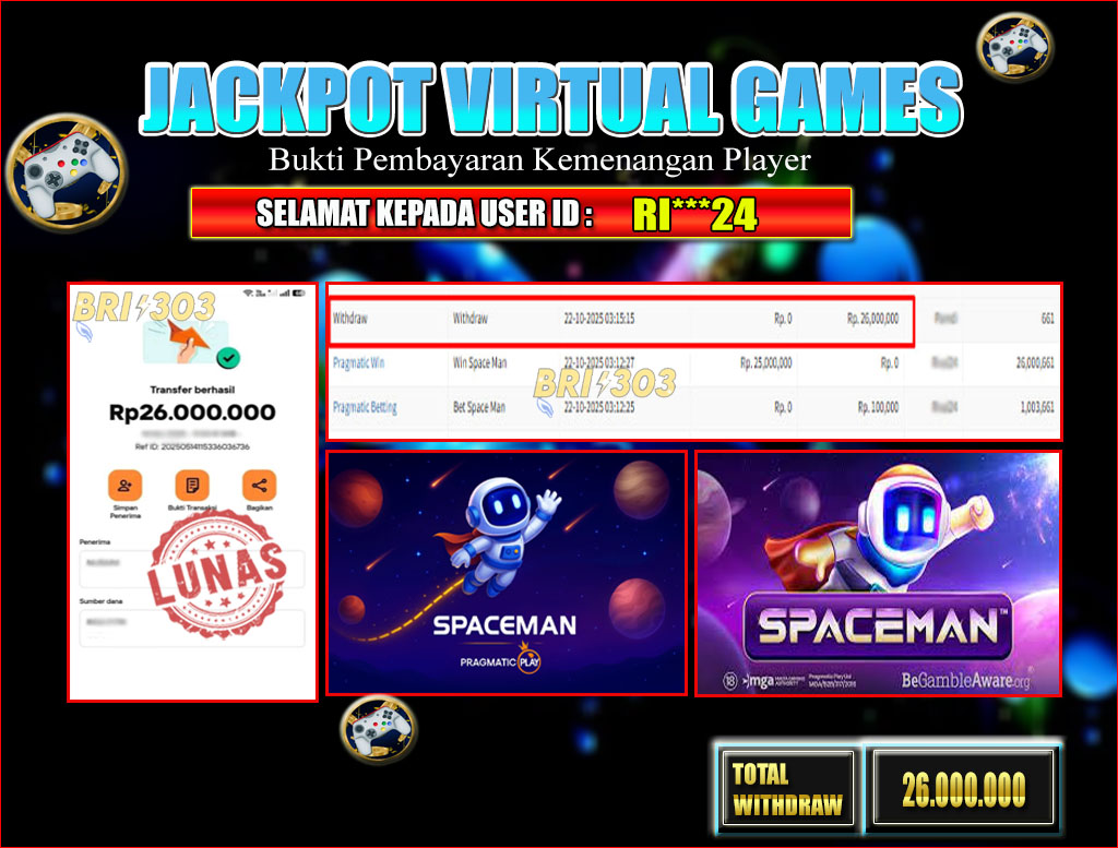 BRI303 JACKPOT VIRTUAL GAMES : Selamat kepada User ID RI***24 telah berhasil memenangkan hadiah besar senilai Rp.26.000.000 di permainan JACKPOT VIRTUAL GAMES: SPACE MAN! Proses pencairan dana hanya memakan waktu 3-5 menit setelah pengisian formulir withdraw. Bukti pembayaran kami adalah SAH/VALID, langsung dari transaksi bank tujuan pemenang.