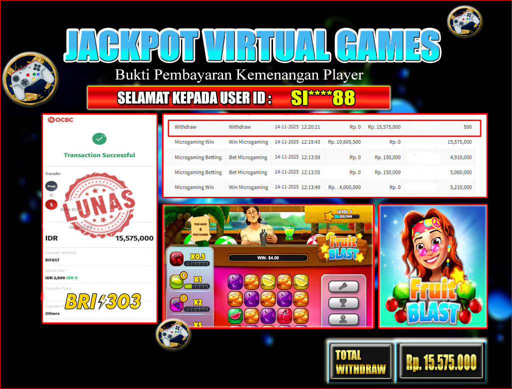 BRI303 JACKPOT VIRTUAL GAMES 14 NOVEMBER Rp. 15.575.000,- LUNAS