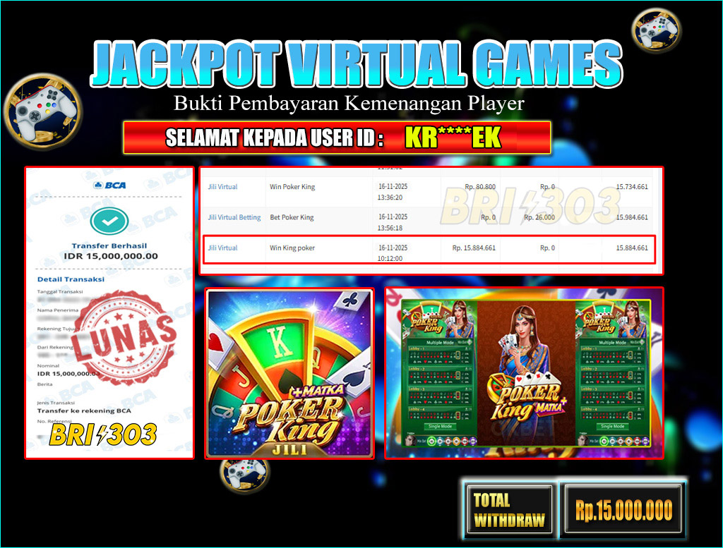 BRI303 JACKPOT VIRTUAL GAMES 16 NOVEMBER Rp. 15.000.000,- LUNAS
