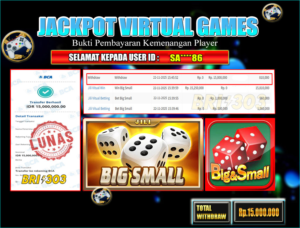 BRI303 JACKPOT VIRTUAL GAMES 22 NOVEMBER Rp. 15.000.000,- LUNAS