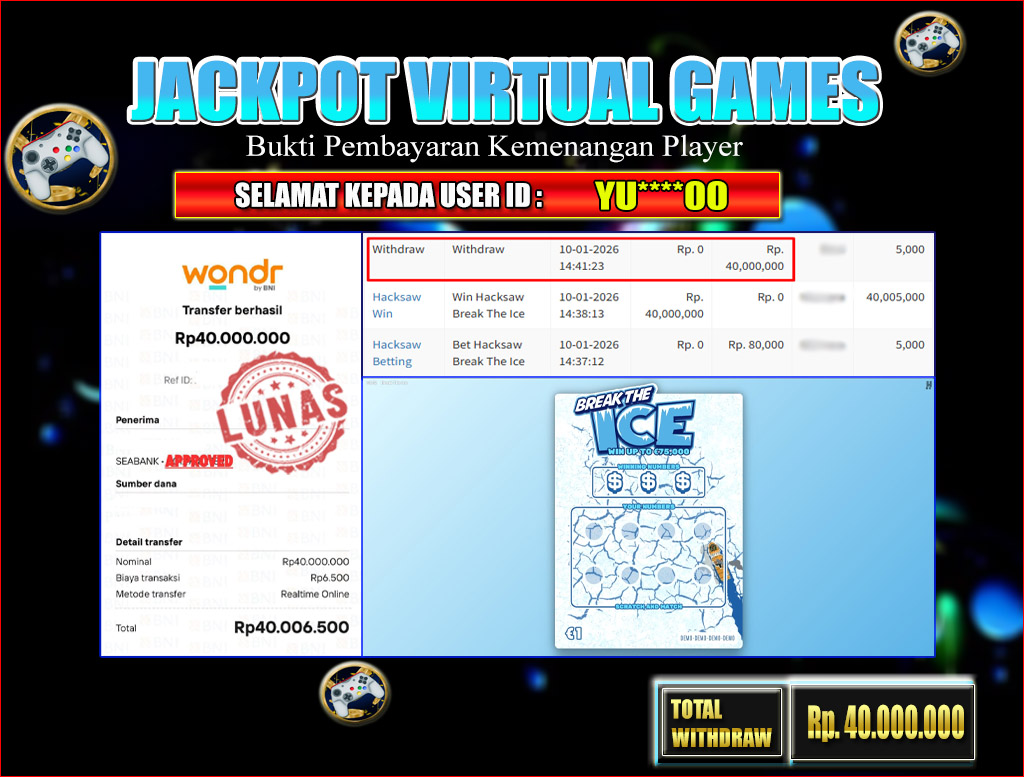BRI303 JACKPOT VIRTUAL GAMES : Selamat kepada User ID: YU****00 telah berhasil memenangkan hadiah besar senilai Rp.40.000.000 di permainan JACKPOT VIRTUAL GAMES : BREAK THE ICE! Proses pencairan dana hanya memakan waktu 3-5 menit setelah pengisian formulir withdraw. Bukti pembayaran kami adalah SAH/VALID, langsung dari transaksi bank tujuan pemenang.
