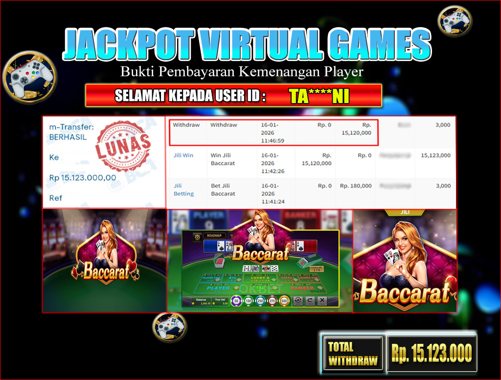 BRI303 JACKPOT VIRTUAL GAMES : Selamat kepada User ID: TA***NI telah berhasil memenangkan hadiah besar senilai Rp.15.123.000 di permainan JACKPOT VIRTUAL GAMES : BACCARAT! Proses pencairan dana hanya memakan waktu 3-5 menit setelah pengisian formulir withdraw. Bukti pembayaran kami adalah SAH/VALID, langsung dari transaksi bank tujuan pemenang.