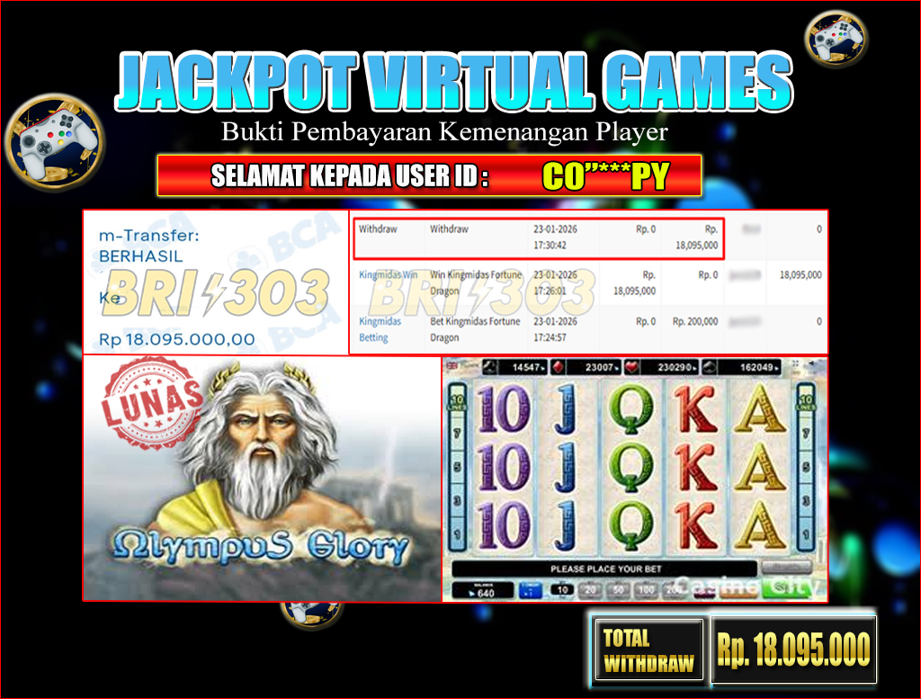 BRI303 JACKPOT VIRTUAL GAMES : Selamat kepada User ID: CO***PY telah berhasil memenangkan hadiah besar senilai Rp.18,095.000 di permainan JACKPOT VIRTUAL GAMES : OLYMPUS GLORY! Proses pencairan dana hanya memakan waktu 3-5 menit setelah pengisian formulir withdraw. Bukti pembayaran kami adalah SAH/VALID, langsung dari transaksi bank tujuan pemenang.