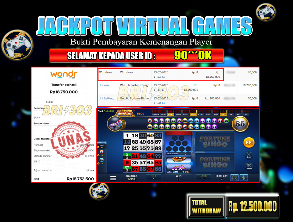 BRI303 JACKPOT VIRTUAL GAMES : Selamat kepada User ID: 90***OK telah berhasil memenangkan hadiah besar senilai Rp.12,500.000 di permainan JACKPOT VIRTUAL GAMES : FORTUNE BINGO! Proses pencairan dana hanya memakan waktu 3-5 menit setelah pengisian formulir withdraw. Bukti pembayaran kami adalah SAH/VALID, langsung dari transaksi bank tujuan pemenang.