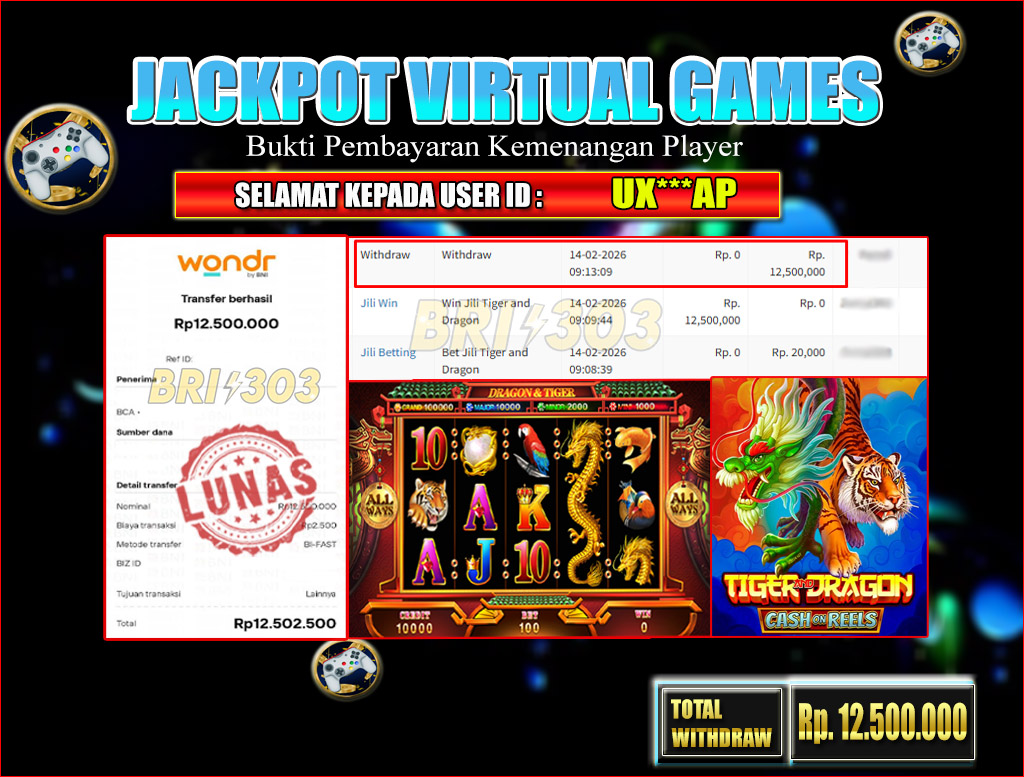BRI303 JACKPOT VIRTUAL GAMES : Selamat kepada User ID: UX***AP telah berhasil memenangkan hadiah besar senilai Rp.12,500.000 di permainan JACKPOT VIRTUAL GAMES : TIGER&DRAGON! Proses pencairan dana hanya memakan waktu 3-5 menit setelah pengisian formulir withdraw. Bukti pembayaran kami adalah SAH/VALID, langsung dari transaksi bank tujuan pemenang.
