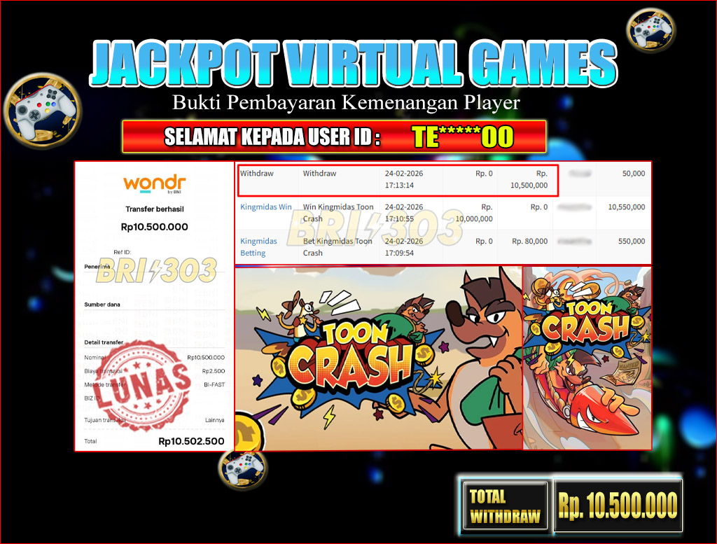 BRI303 JACKPOT VIRTUAL GAMES 24 FEBRUARI 2026 Rp. 10.500.000,- LUNAS