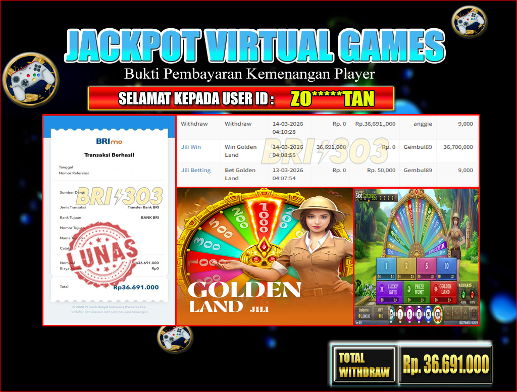 BRI303 JACKPOT VIRTUAL GAMES 14 MARET 2026 Rp. 36.691.000,- LUNAS