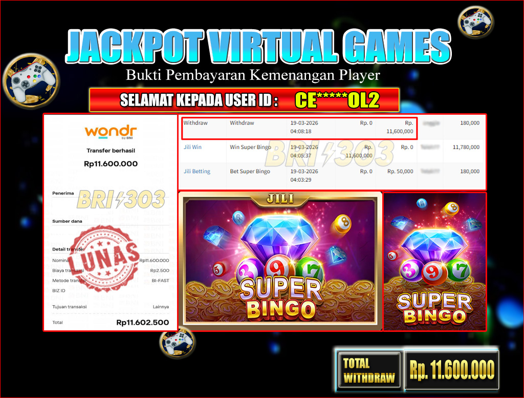 BRI303 JACKPOT VIRTUAL GAMES 19 MARET 2026 Rp. 11.600.000,- LUNAS