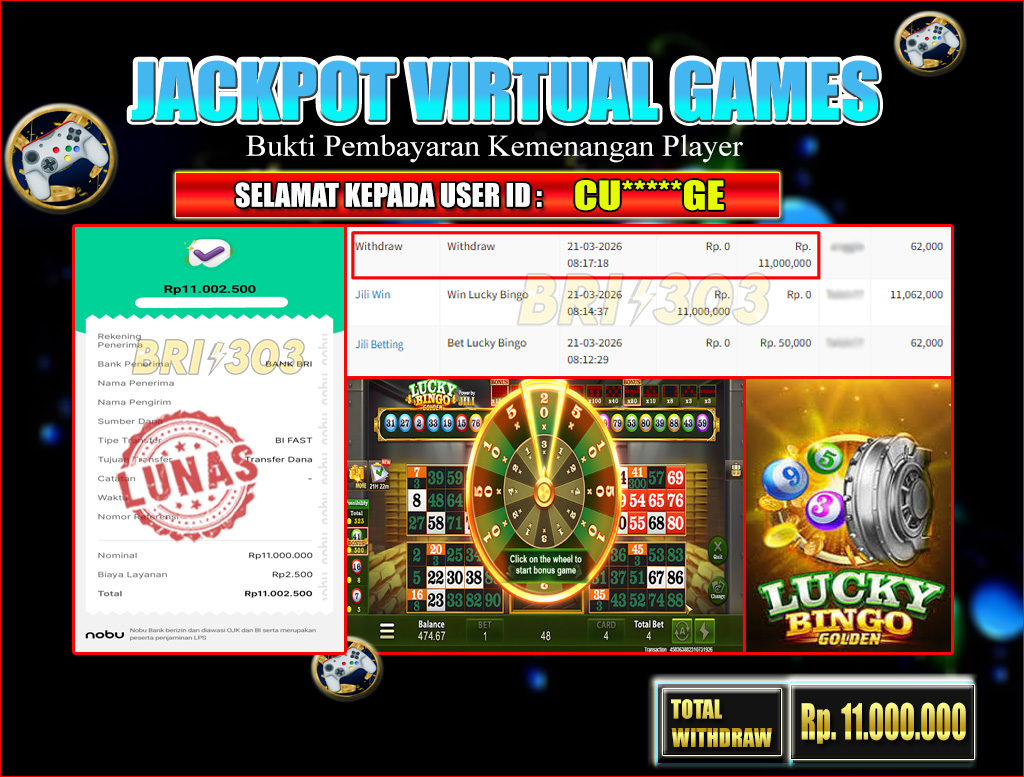 BRI303 JACKPOT VIRTUAL GAMES 21 MARET 2026 Rp.10.500.000,- LUNAS