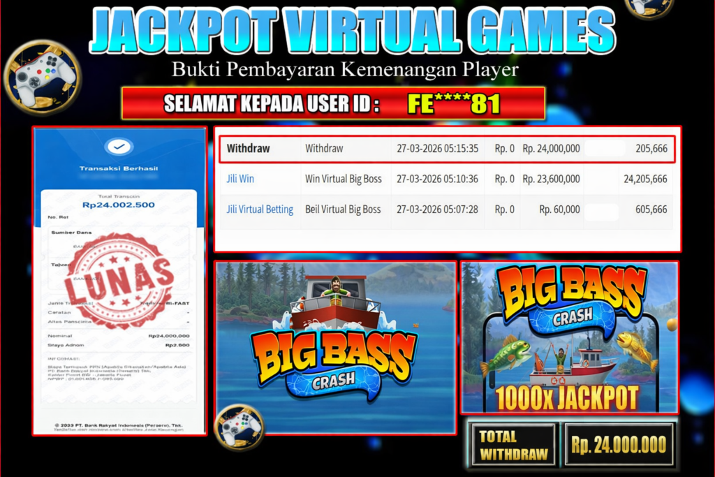 BRI303 JACKPOT VIRTUAL GAMES : Selamat kepada User ID: FE****81  telah berhasil memenangkan hadiah besar senilai Rp.24.000.000 di permainan JACKPOT VIRTUAL GAMES: BIG BASS! Proses pencairan dana hanya memakan waktu 3-5 menit setelah pengisian formulir withdraw. Bukti pembayaran kami adalah SAH/VALID, langsung dari transaksi bank tujuan pemenang.