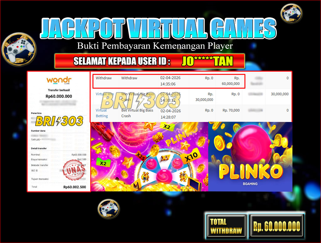 BRI303 JACKPOT VIRTUAL GAMES 02 APRIL 2026 Rp.60.000.000,- LUNAS