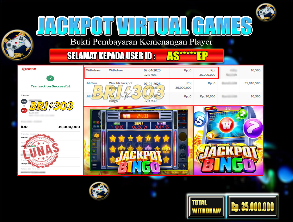 BRI303 JACKPOT VIRTUAL GAMES 07 APRIL 2026 Rp.35.000.000,- LUNAS